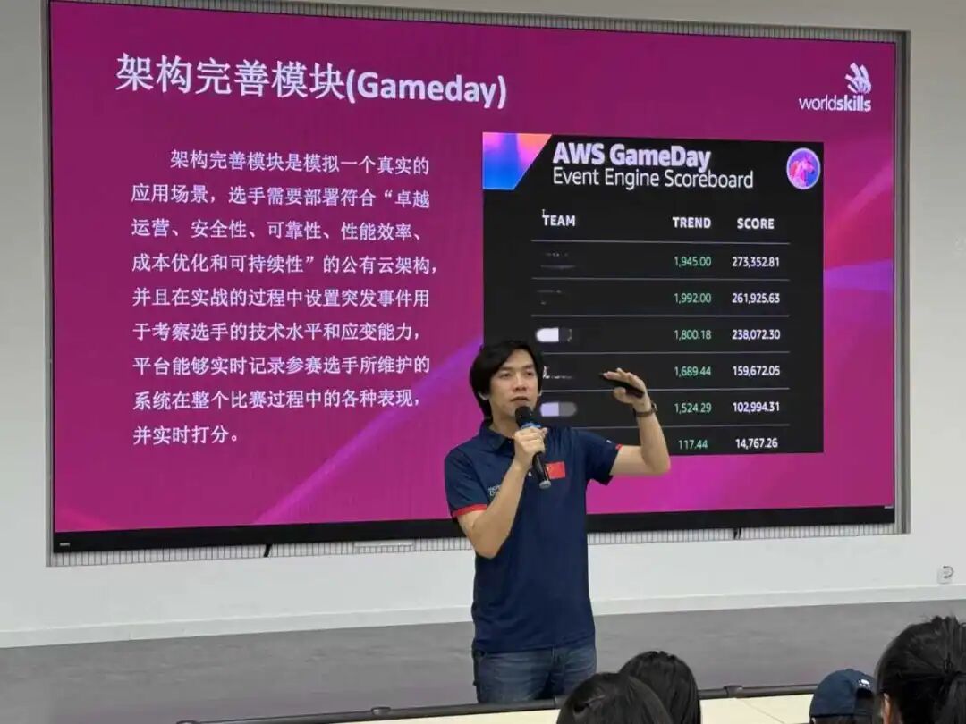 2018年云计算项目首次加入世界技能大赛,孙健就担任天津集训队教练组长和国家裁判,此后又担任了世界技能大赛云计算项目国家集训队教练,并助力世界技能大赛云计算项目国家队取得金牌两连冠的成绩。凭借丰富的竞赛指导及执裁经验,他与他的团队带领选手利用企业级云平台搭建电商、物联网、数据分析等智能信息系统,故意设置各种故障点,让选手在“解决问题”中掌握技能。全国技能大赛云计算项目的选手要在3天18个小时的时间里,完成Questing、架构完善和故障排除3个竞赛模块任务,涵盖网络技术、信息安全、物联网、人工智能、数据分析等多项前沿技术。“别看着赛场只有一张桌子、一台电脑,这里的每一秒都在比‘精准’和‘应变’。”谈及云计算赛场的独特性,孙健的描述充满画面感。与其他赛项可视化操作不同,云计算的比拼藏在代码里、架构中:选手的每一次参数配置、每一条安全规则设置,都会被系统实时量化打分;电子屏上跳动的分数,背后是对“卓越运营、安全、成本控制、可靠性”等云计算核心能力的极致考验。
